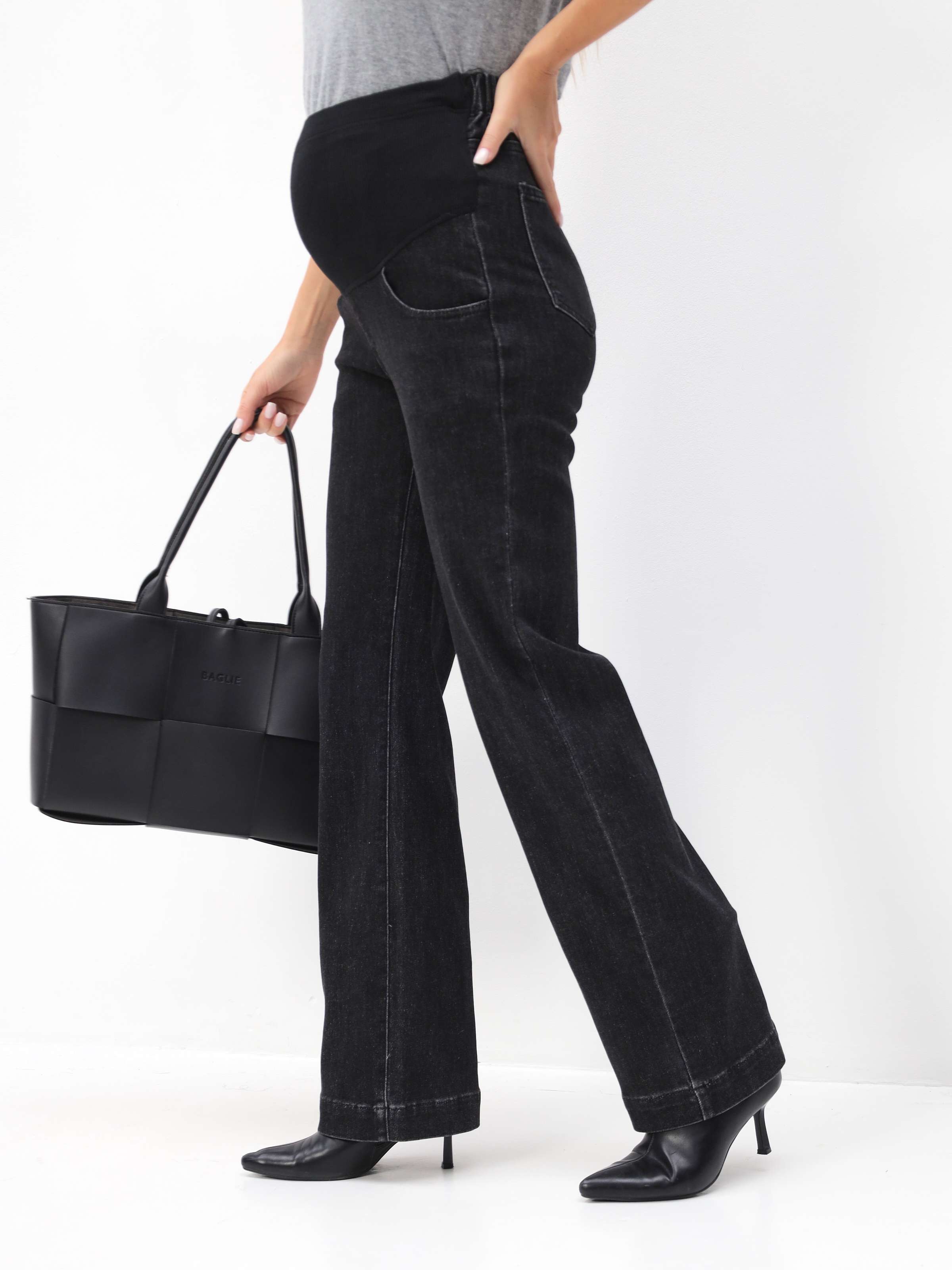 Джинсы для беременных стрейч прямые, силуэт клеш от бедра, с трикотажной вставкой спереди на животик с возможностью регулировки резинкой по верхнему краю. Модная модель из демисезонной джинсы стрейч в приятной серой варке для стильных будущих мамочек! Фигурные карманы сзади отделаны отстрочкой, спереди два действующих кармашка.