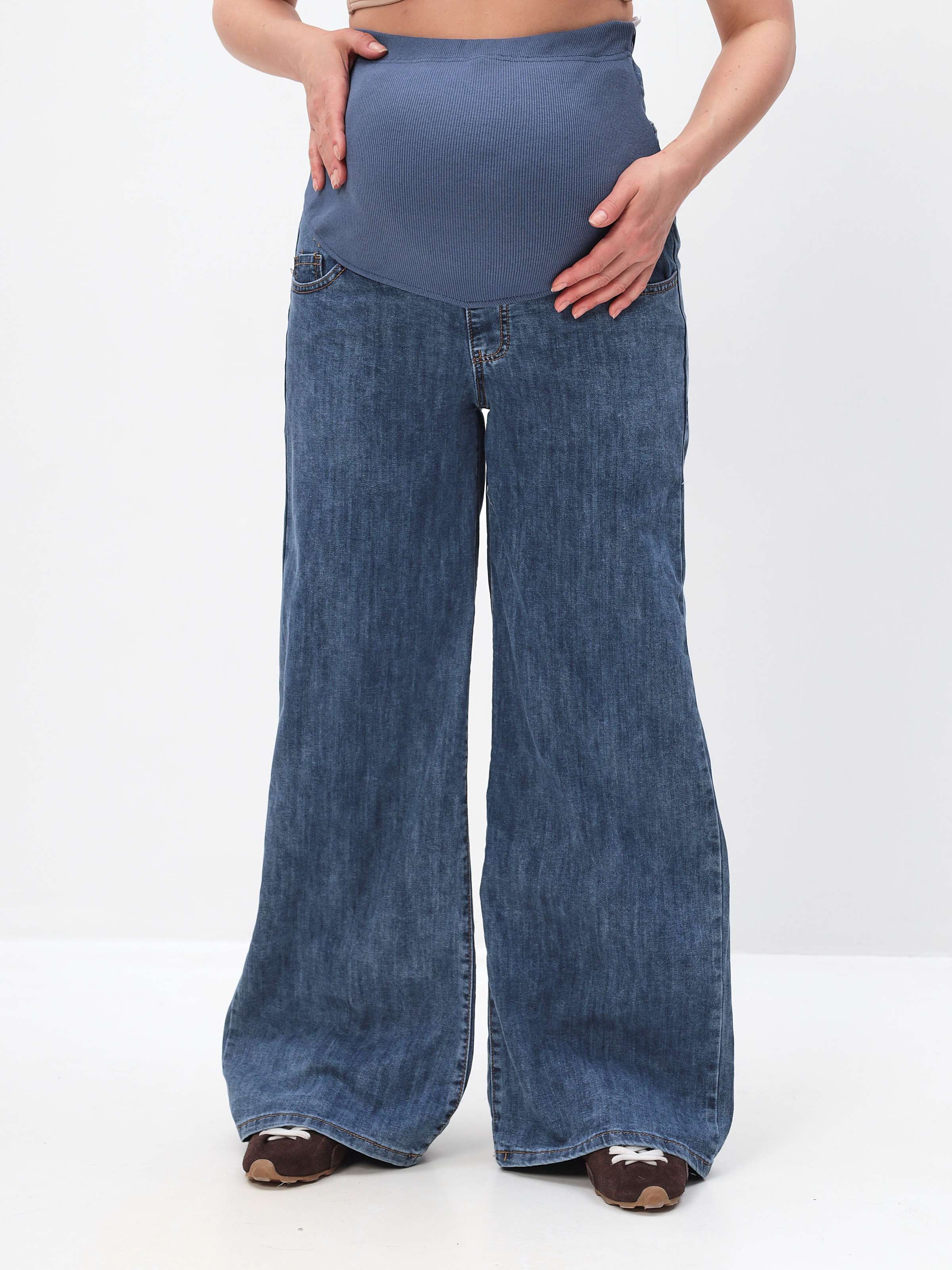 Джинсы для беременных летние прямые, силуэт клеш от бедра, с трикотажной вставкой спереди на животик с возможностью регулировки резинкой по верхнему краю. Модная модель из облегченной летней джинсы стрейч в приятной светлой варке для стильных будущих мамочек! Фигурные карманы сзади отделаны отстрочкой, спереди два действующих кармашка.